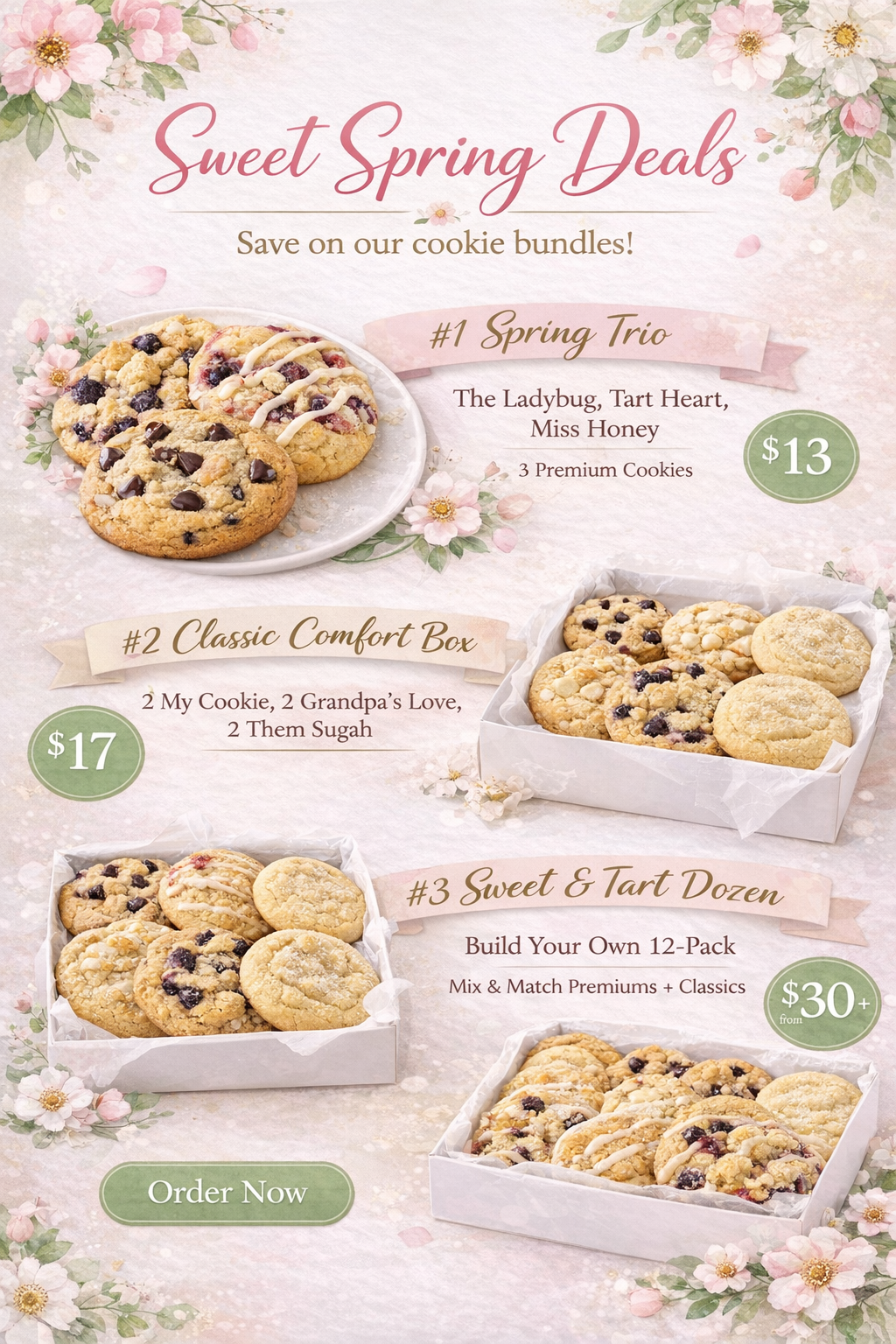 For a limited time, enjoy exclusive seasonal bundle pricing from our Spring Cookie Collection. Each set is baked fresh in small batches and available for preorder only.